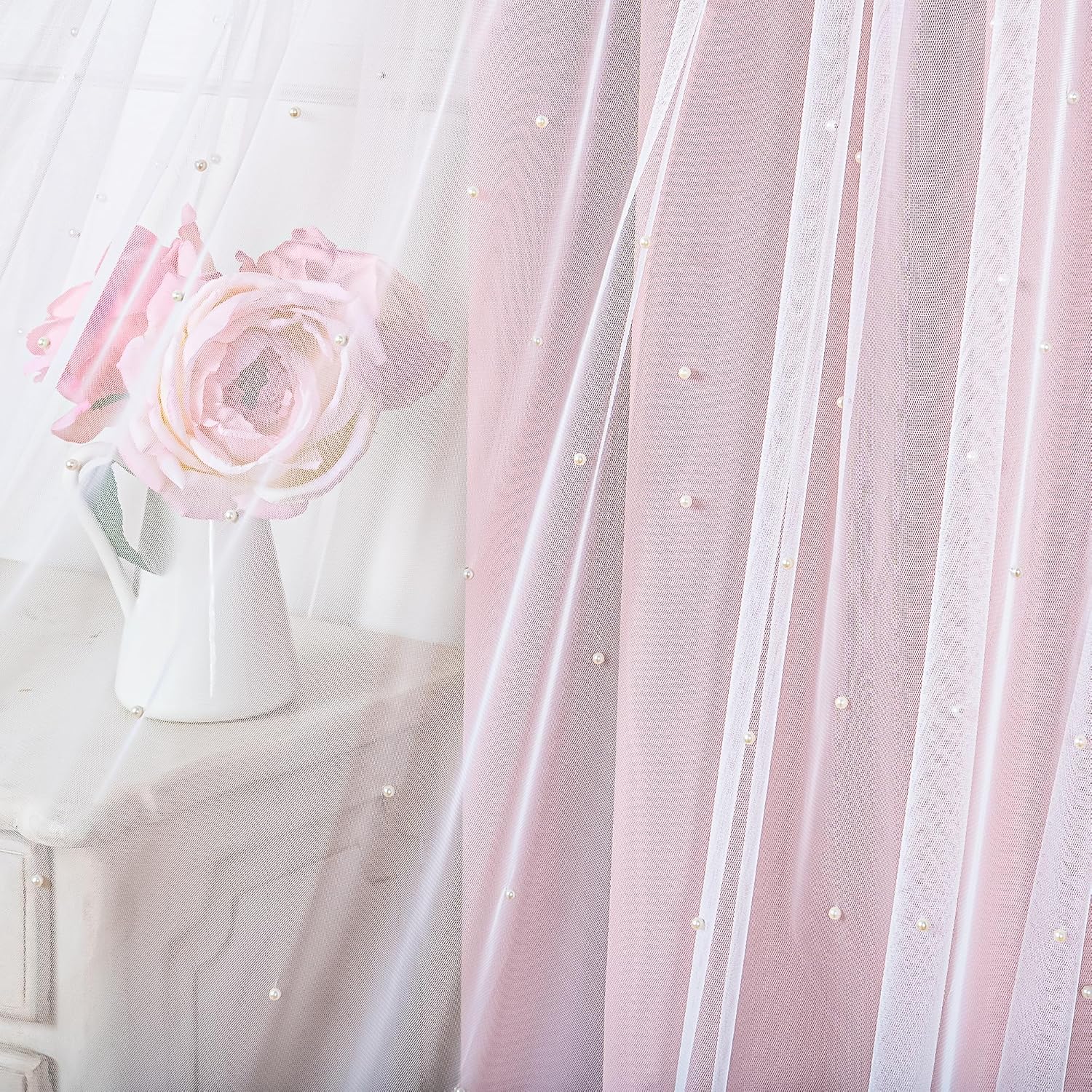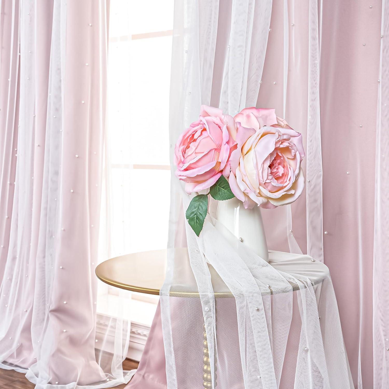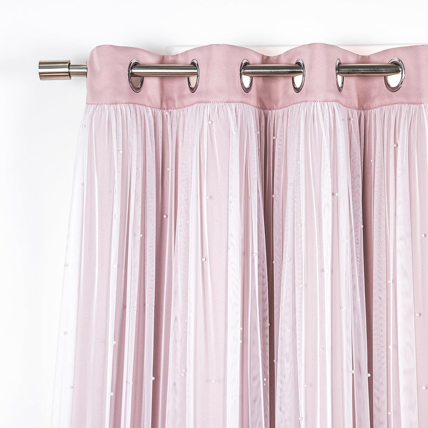Best Home Fashion Pearl Beaded Lace Overlay Blackout Curtain Set, Double Layer Silver Grommet Thermal Insulated Window Panels for Bedroom, Living Room, Dining Room- 52" W x 84" L, Dustypink
