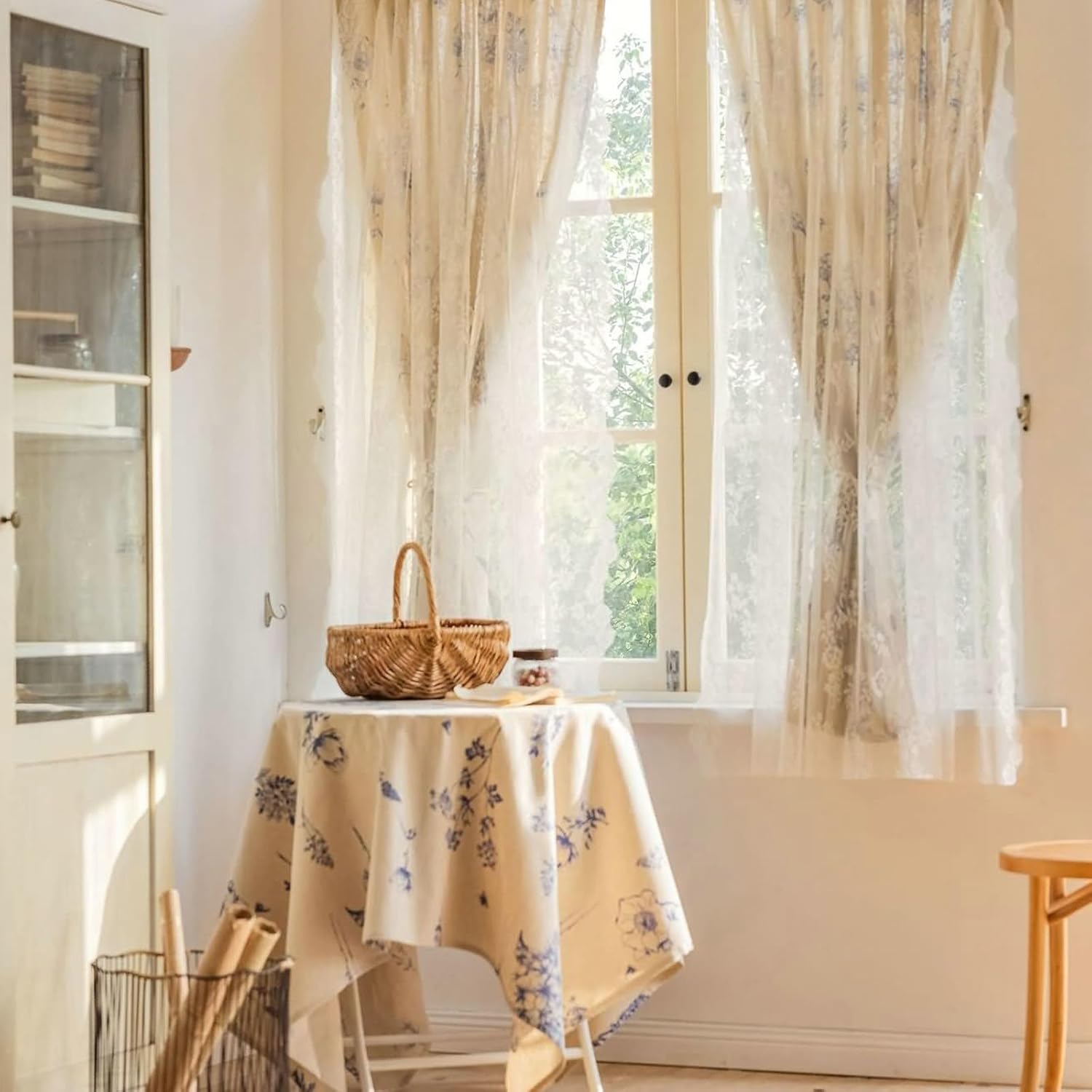 Daesar Semi Blackout Curtains for Bedroom 2 Panels, Polyester Cotton Rod Pocket Window Curtains 55" W x 87" H Drapes Double Layered Flowers Lace Beige Blue Blackout Curtains for Living Room