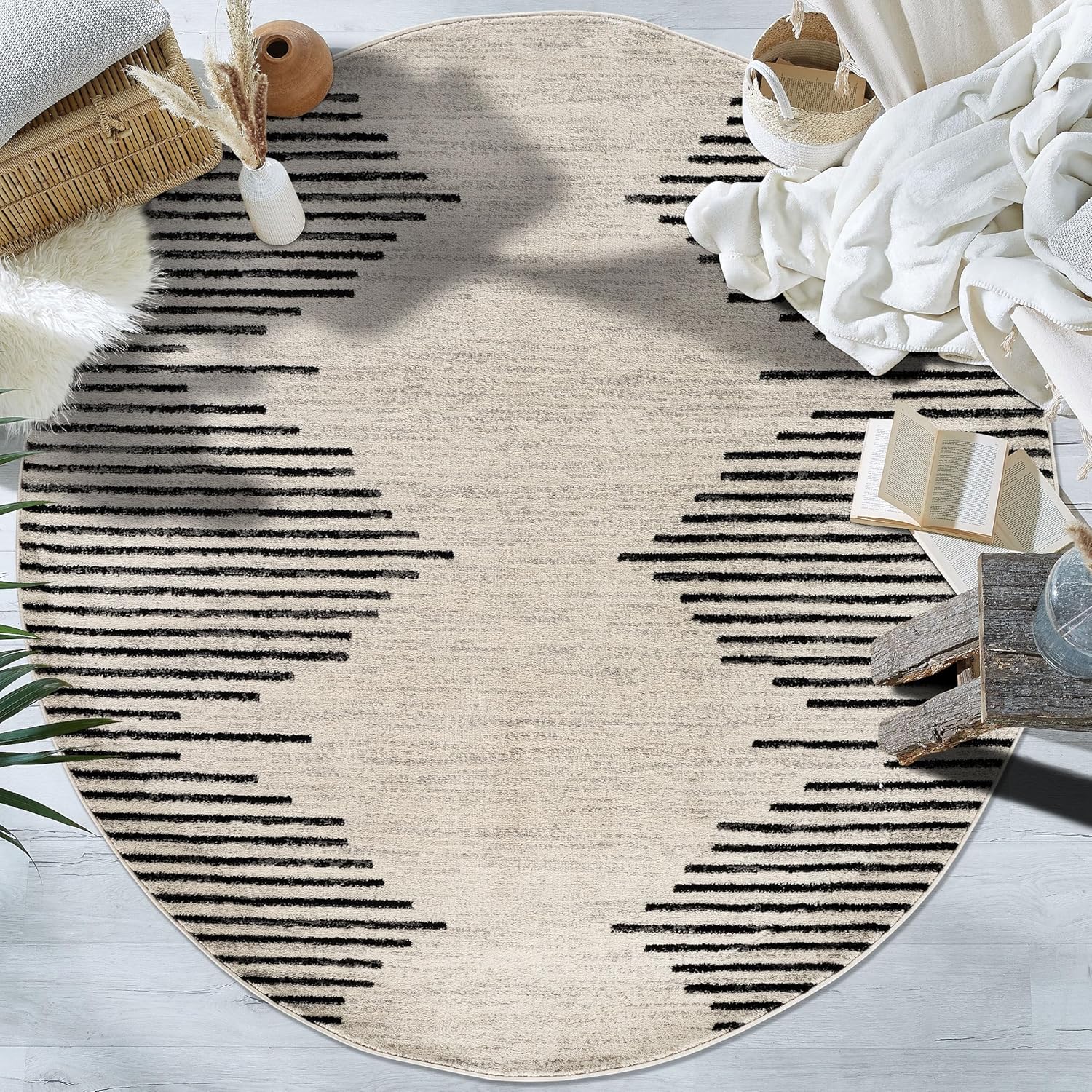 Rugshop Bohemian Stripe Stain Resistant High Traffic Living Room Kitchen Bedroom Dining Home Office Round Rug 8' Cream